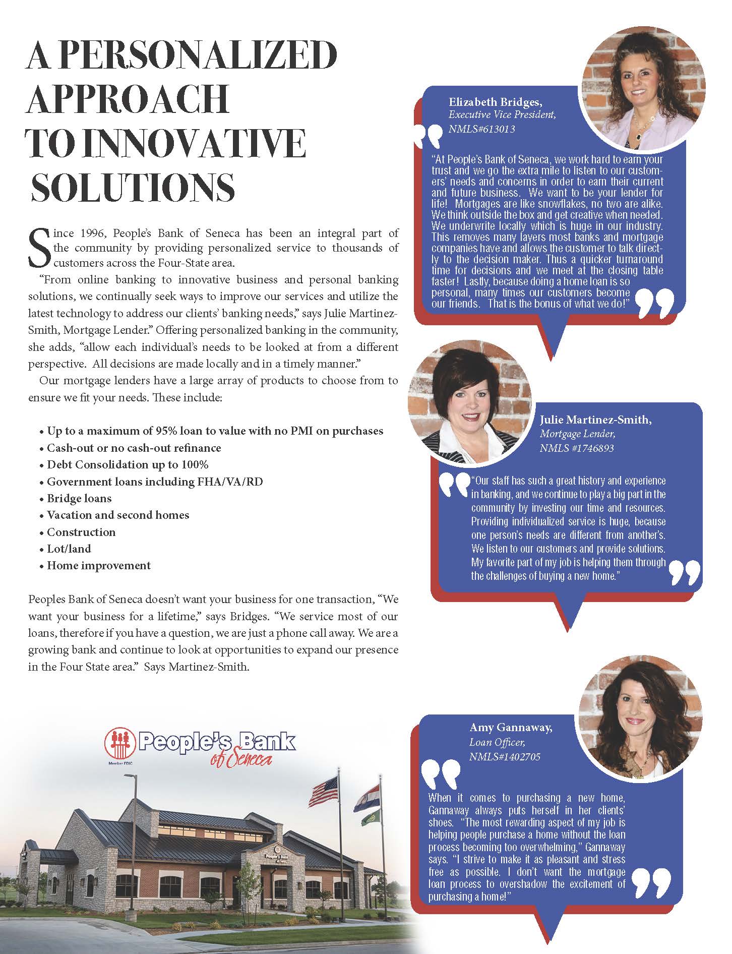 Peoples Bank of Seneca doesn’t want your business for one transaction, “We want your business for a lifetime,” says Bridges. “We service most of our loans, therefore if you have a question, we are just a phone call away. We are a growing bank and continue to look at opportunities to expand our presence in the Four State area.” Says Martinez-Smith.