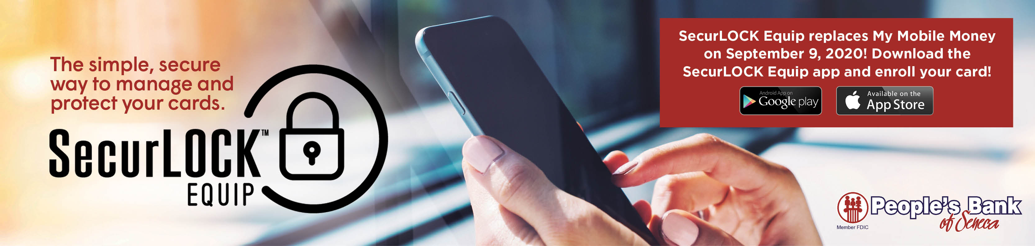 In an effort to keep up with the latest fraud protection available, People’s Bank of Seneca’s My Mobile Money app will be replaced with SecurLOCK Equip. Your current My Mobile Money app will no longer be active beginning Wednesday, September 9th. SecurLOCK Equip will become the new platform, so be sure to download the SecurLOCK Equip app.